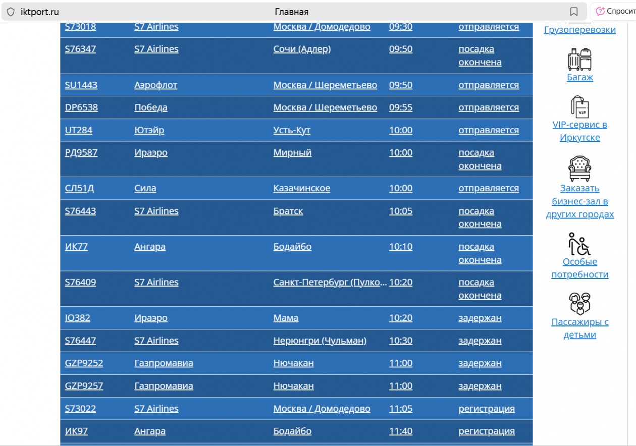 Также задерживается прибытие четырех рейсов в воздушную гавань столицы Приангарья. По данным онлайн-табло аэропорта Иркутска, с опозданием приземлятся самолеты из Усть-Кута, Читы, Мамы и Чары.