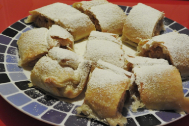 - Выложите по 1-1,5 ст. ложки начинки на край каждой полоски и сверните в рулет;