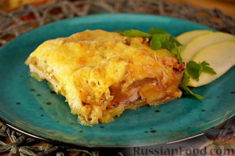 Отбивные из свинины запекаются между слоями картофеля, лука и яблок. Ещё добавляются сметанно-сливочная заливка и натёртый сыр. Лук и мясо предварительно обжариваются — так вкус блюда будет более насыщенным и выразительным. Рецепт публикует ИА AngarskMedia.