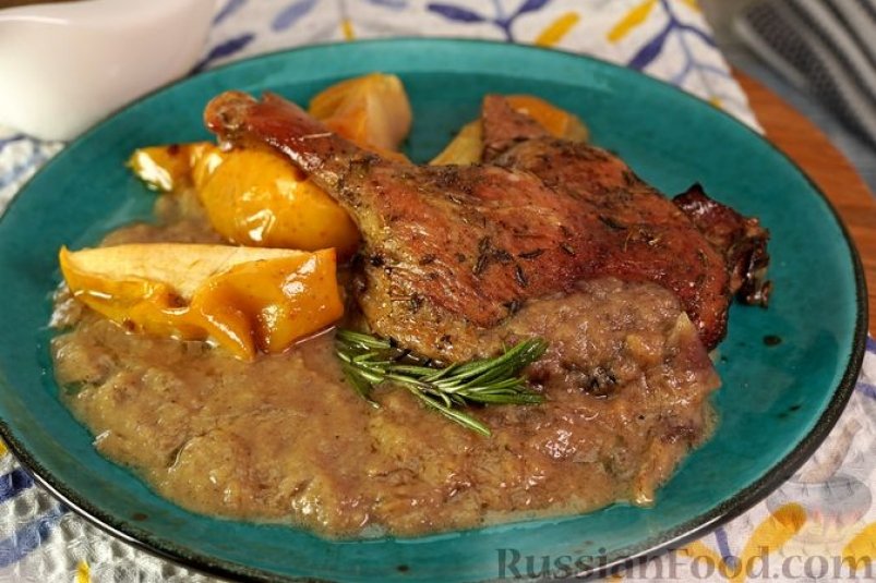 Утиную ножку с кусочками яблока выкладываем на тарелку. Поливаем соусом и подаём к столу.