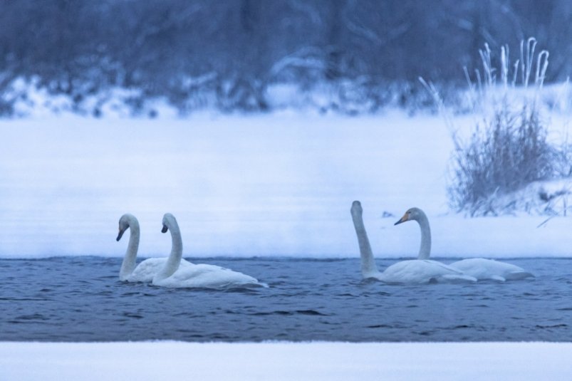AngarskMedia, 7 января. В центре Приозерска стая диких лебедей-кликунов выбрала для зимовки местные полыньи. Несмотря на понижение температуры и активное промерзание водоемов, мощное течение реки Вуоксы создает естественные "окна" в ледяном панцире.