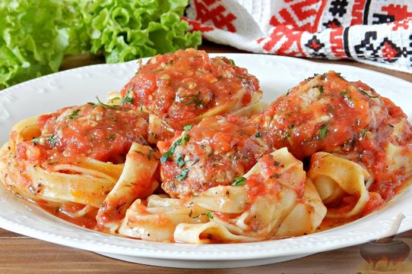 Гнёзда с сюрпризом: сочный фарш в макаронных кольцах под томатным соусом