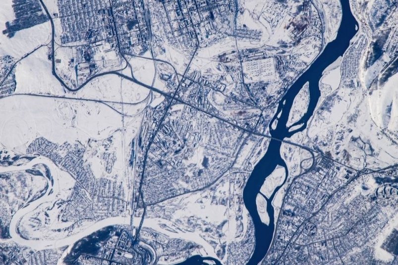 По словам космонавта, с высоты космоса город выглядит особенно выразительно: темная линия Ангары словно рассекает белоснежное полотно, кварталы выстраиваются в чёткую геометрию, а вокруг простираются огромные пространства, в которых ощущаются масштаб, тишина и внутренняя сила сибирской земли.