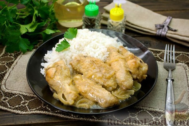 Куриные крылышки, тушенные с луком и сметаной, готовы. Подаём крылышки с любимым гарниром, например с отварным рисом, картофельным пюре или гречкой.