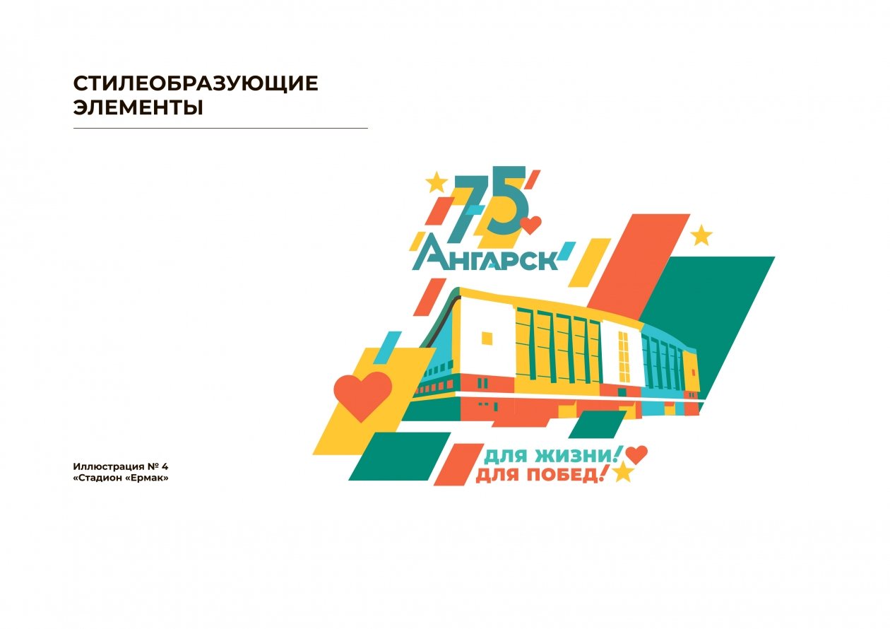 Цветовое решение брендбука строится на четырех основных оттенках, а графическое наполнение дополняют силуэты знаковых городских объектов. В их числе — ангарские ворота, здание почтамта, памятник покорителю космоса, ДК "Нефтехимик" и "Современник", а также Дворец спорта "Ермак". Все элементы выполнены в едином стиле и могут использоваться как по отдельности, так и в различных композициях.