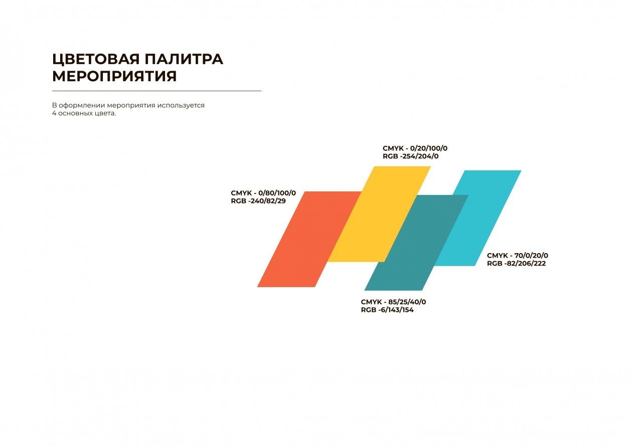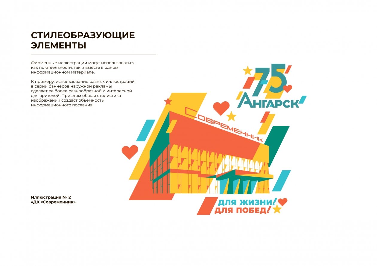 Цветовое решение брендбука строится на четырех основных оттенках, а графическое наполнение дополняют силуэты знаковых городских объектов. В их числе — ангарские ворота, здание почтамта, памятник покорителю космоса, ДК "Нефтехимик" и "Современник", а также Дворец спорта "Ермак". Все элементы выполнены в едином стиле и могут использоваться как по отдельности, так и в различных композициях.