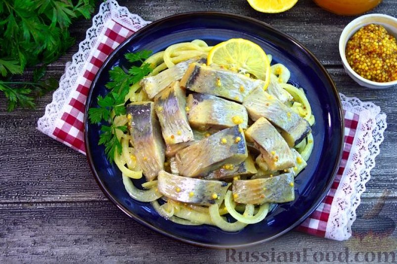 Селёдка, маринованная с луком в горчично-медовом маринаде, готова.