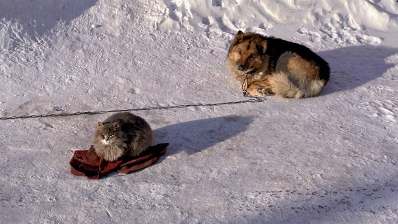 IrkutskMedia, 12 февраля. Фотография из в социальных сетях растрогала жителей Иркутска в разгар январских морозов. Кошка и собака на одной из городских автостоянок грели друг друга, чтобы пережить холода. Пушистая кошка забиралась псу на спину и ночевала с ним в будке — так они и коротали студеные дни и ночи. Редакция решила разыскать стоянку и узнать эту историю.