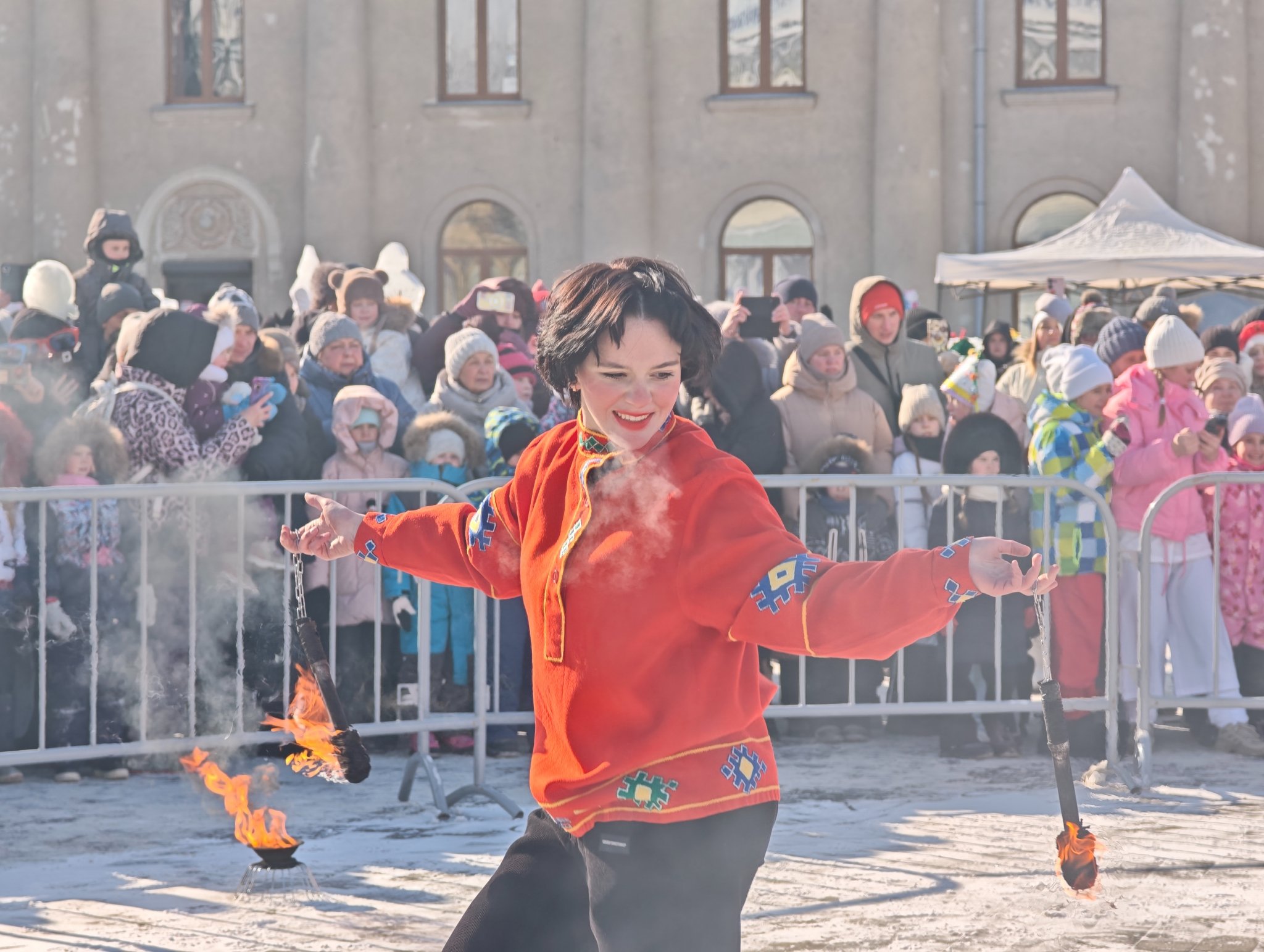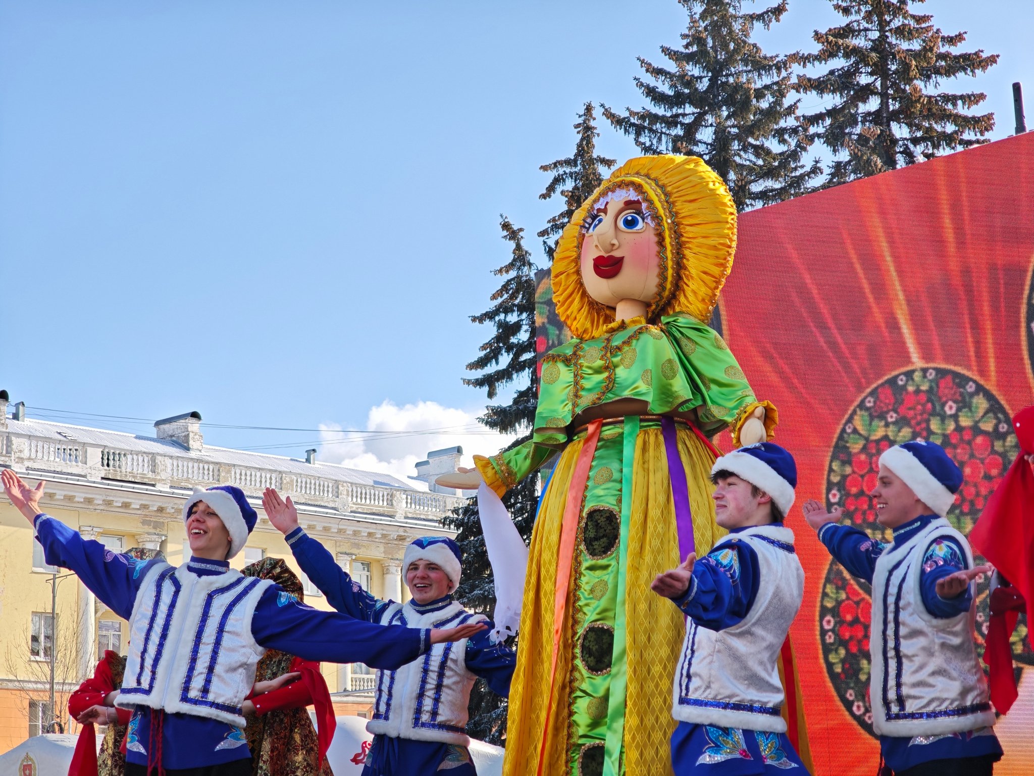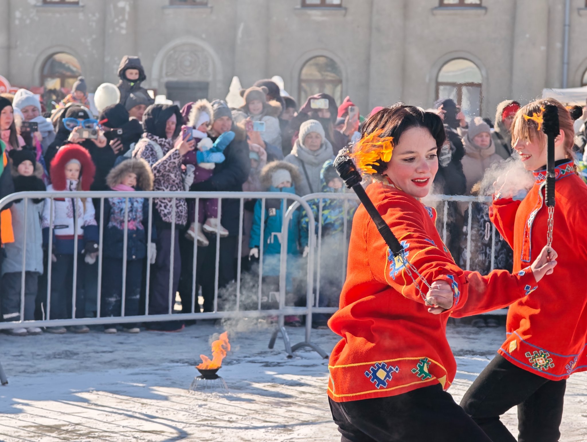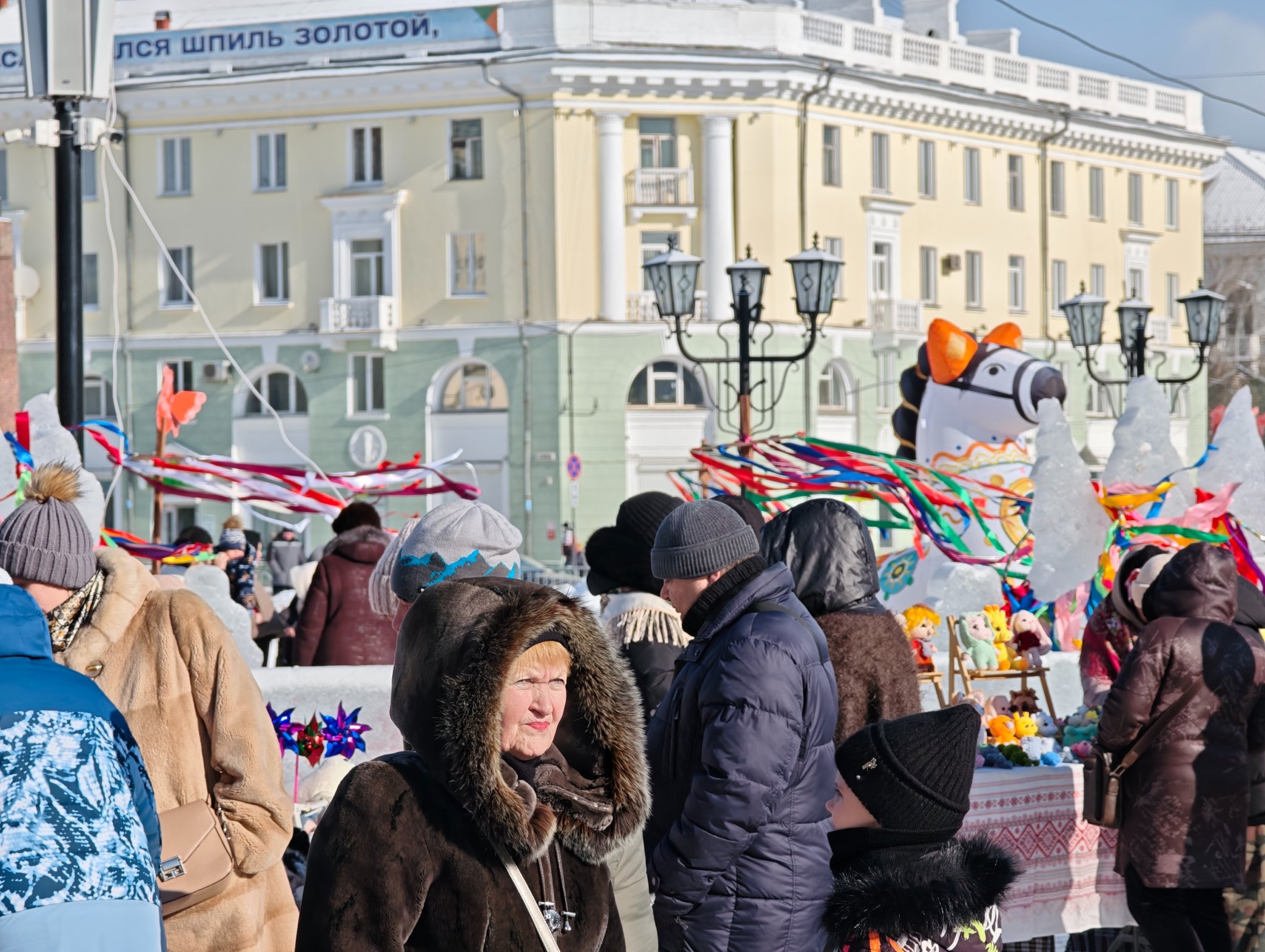 На площади развернулись торговые ряды с угощениями. В воздухе витал аромат свежеиспеченных блинов — главного символа Масленицы.