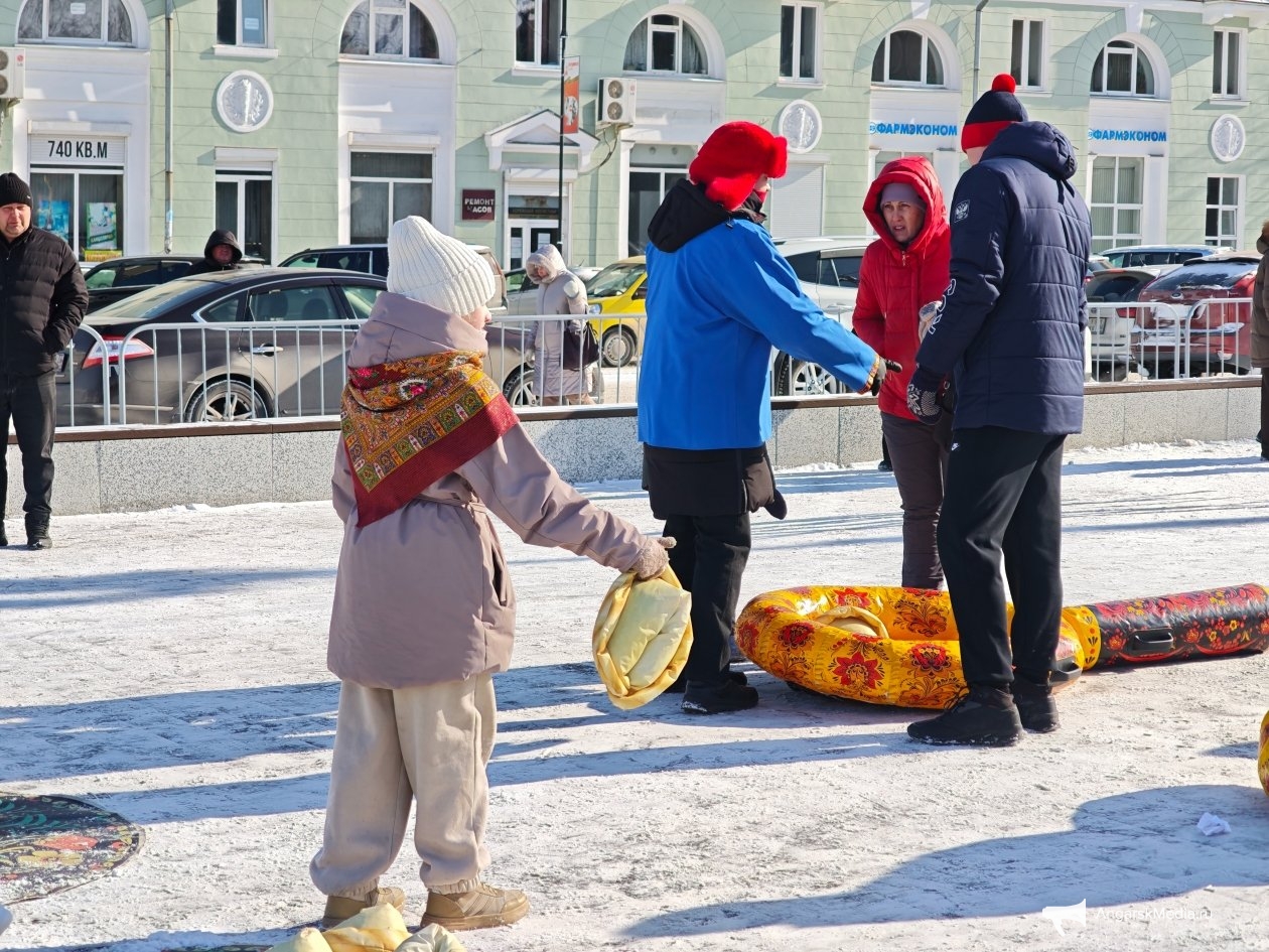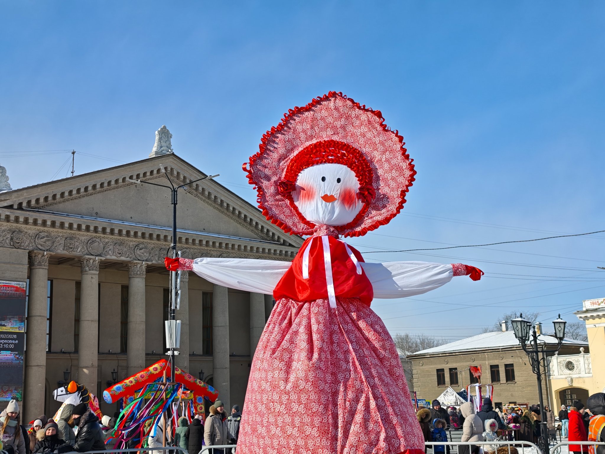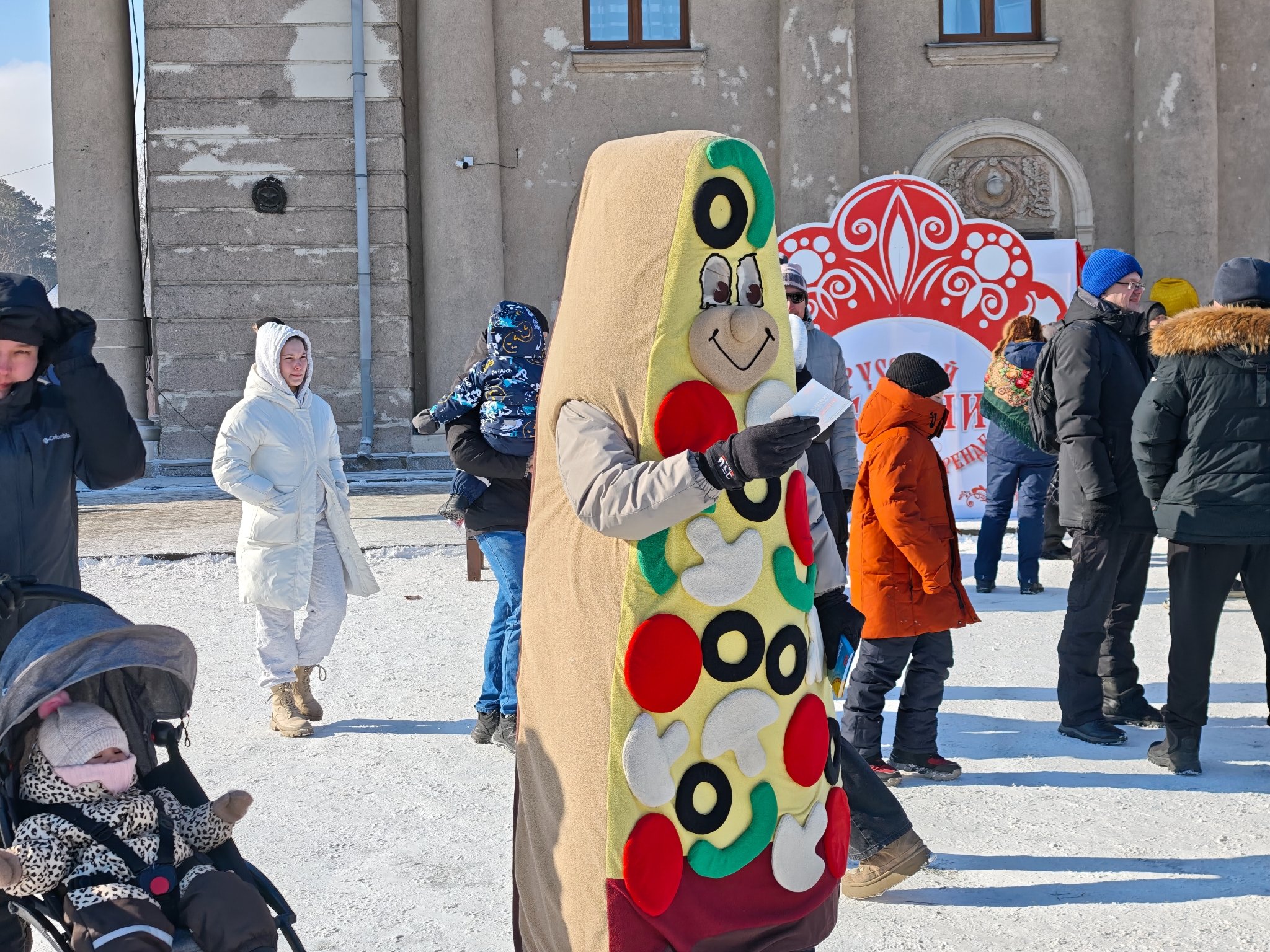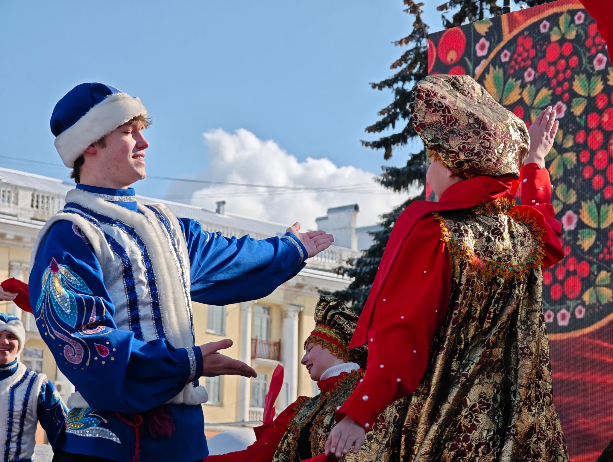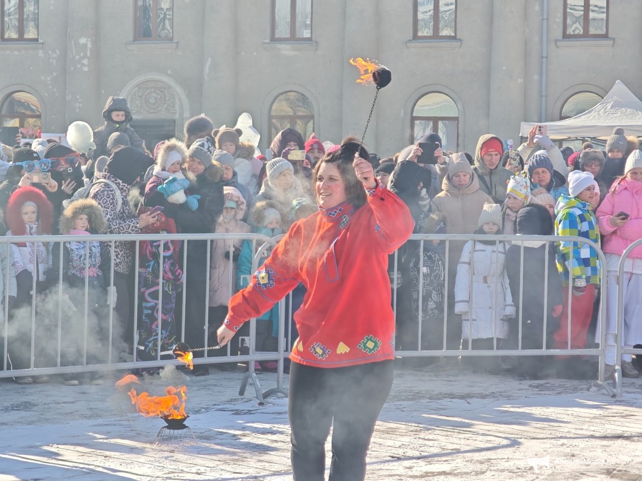 На площади развернулись торговые ряды с угощениями. В воздухе витал аромат свежеиспеченных блинов — главного символа Масленицы.
