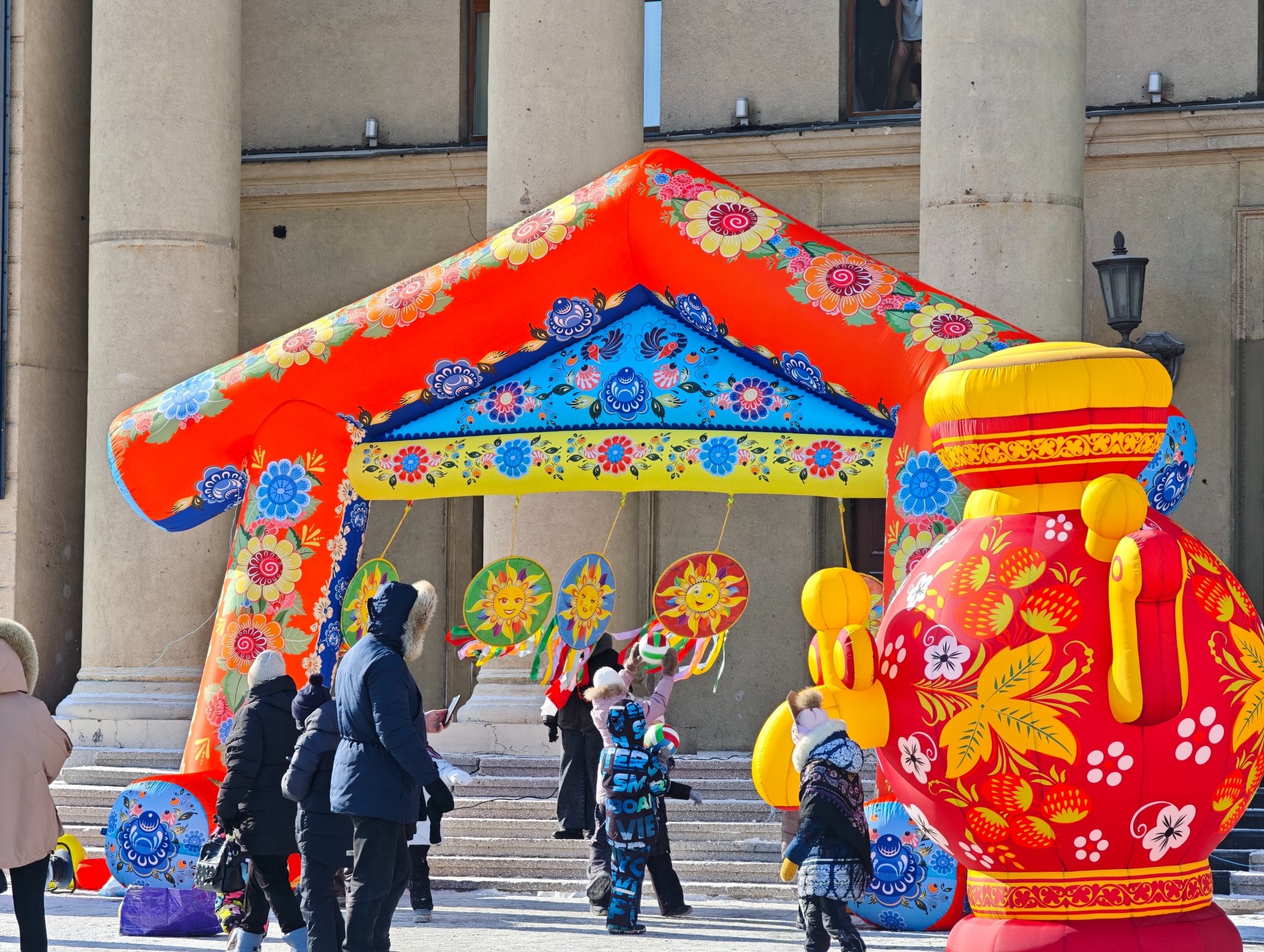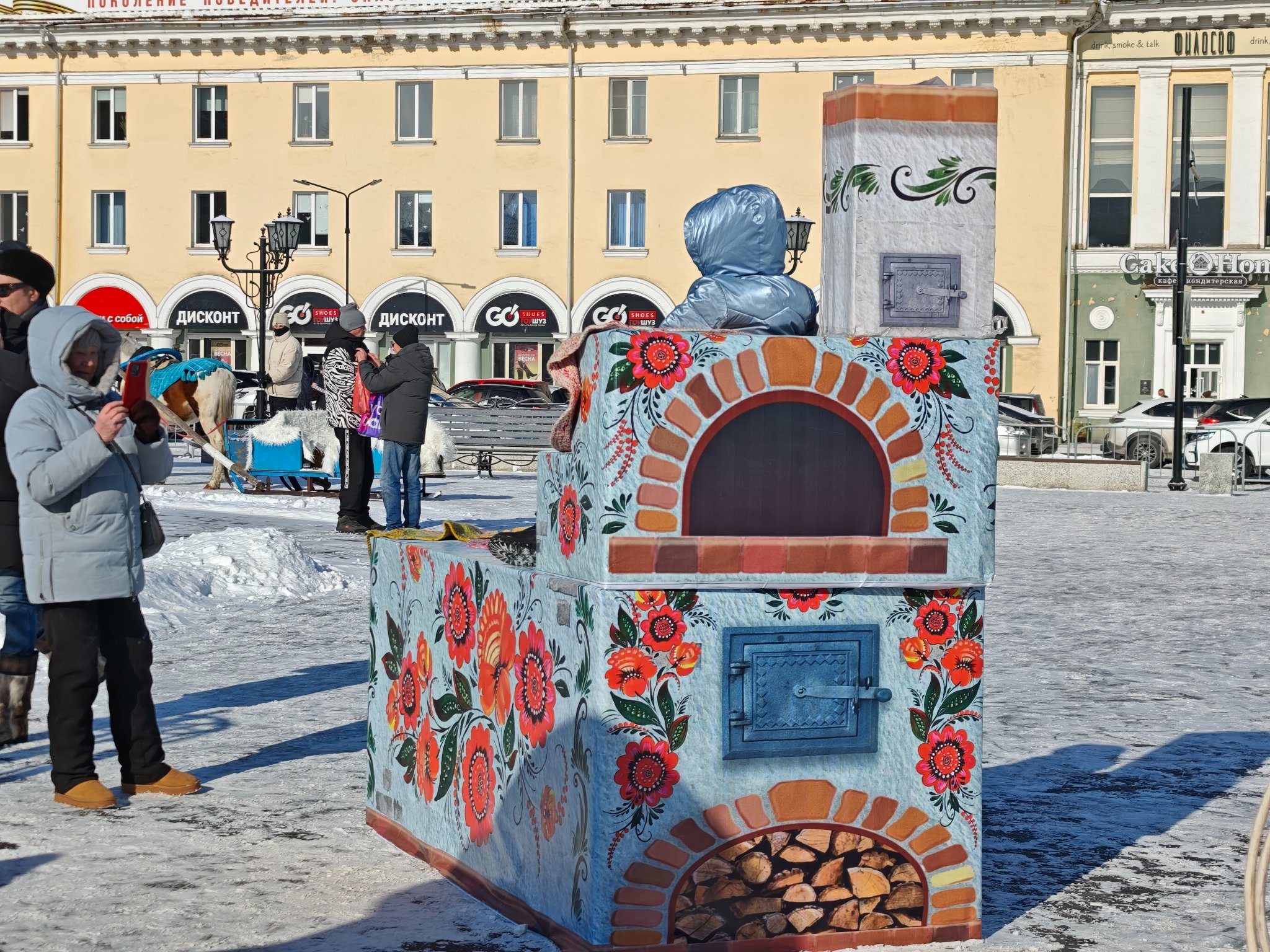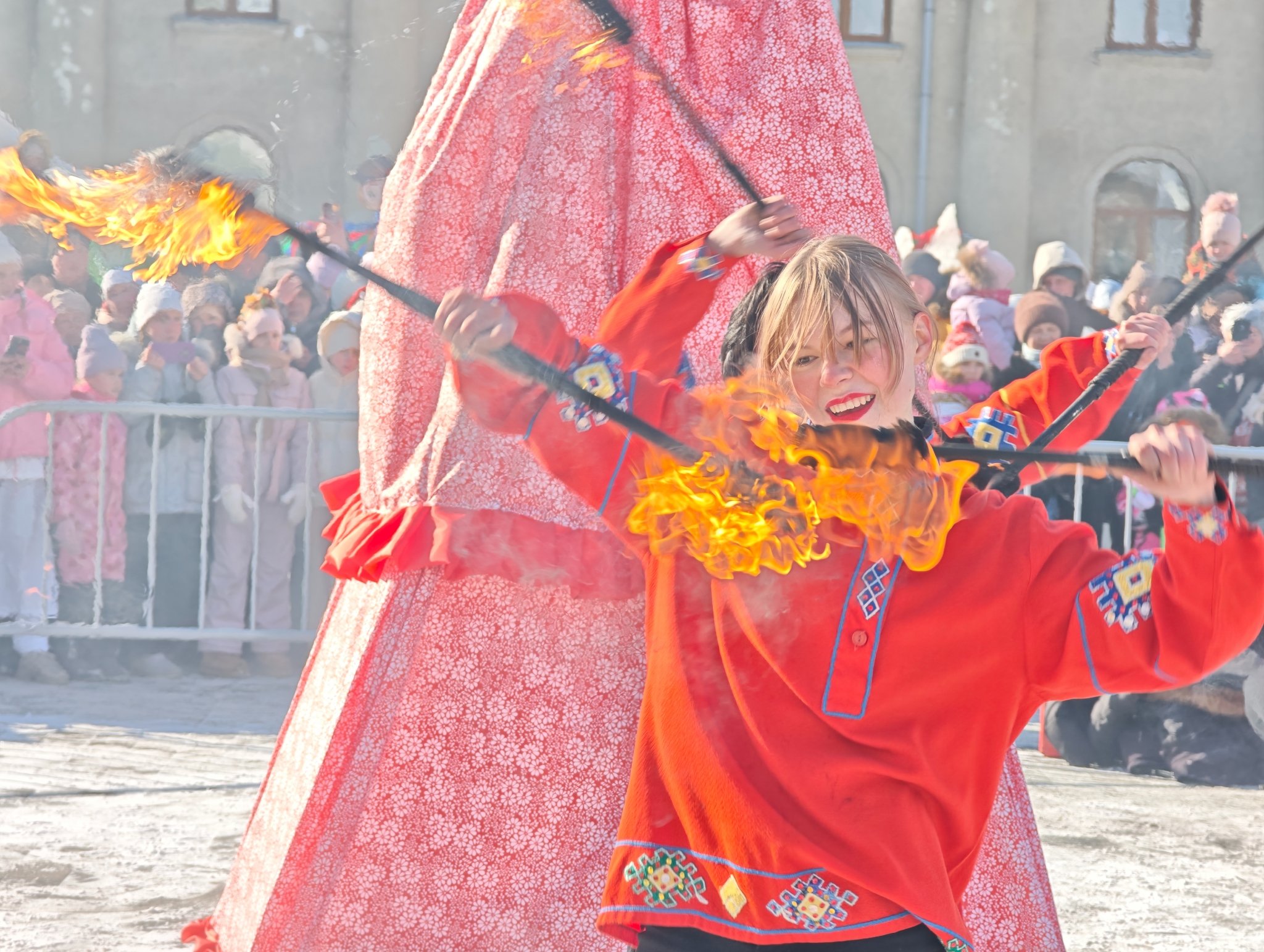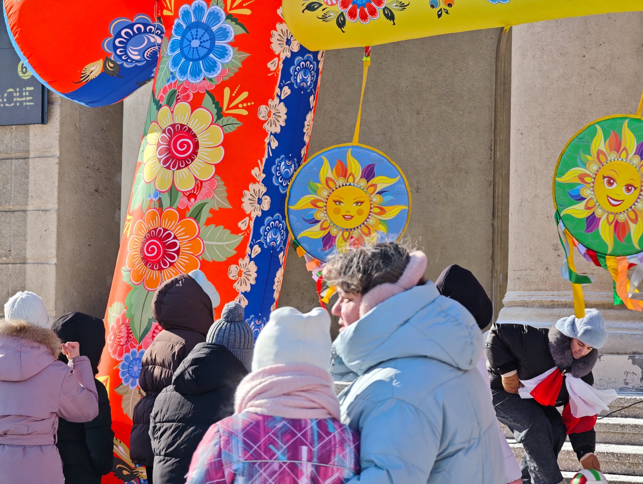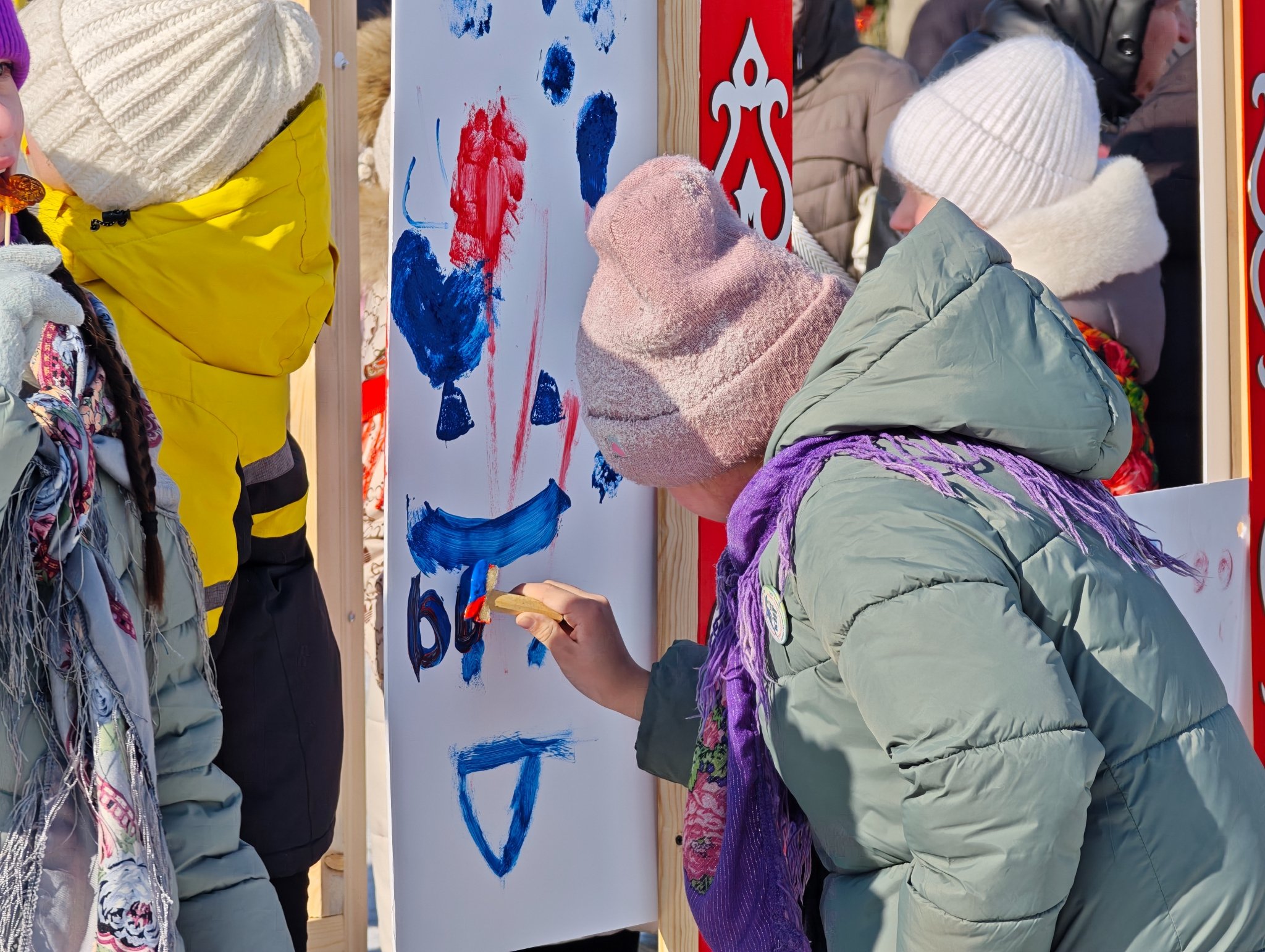 На площади развернулись торговые ряды с угощениями. В воздухе витал аромат свежеиспеченных блинов — главного символа Масленицы.