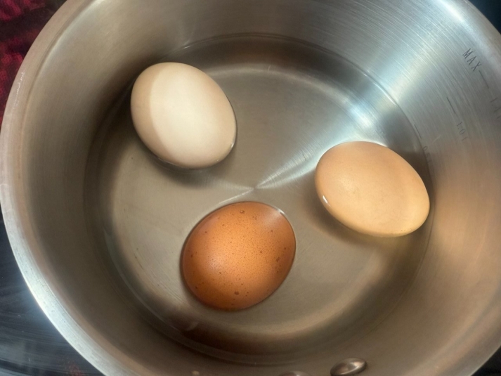 Вареные яйца переместить в глубокую посуду с холодной водой.
