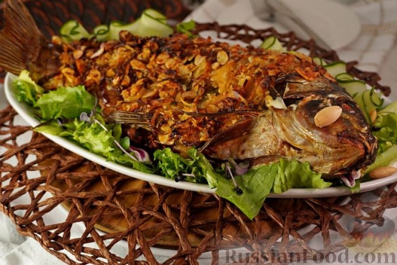 Целый карп запекается под слоем обжаренного лука, панировочных сухарей и миндальных лепестков. Слегка хрустящая корочка сохраняет все соки внутри, рыба получается очень нежной и сочной. Об этом сообщает ИА AngarskMedia.
