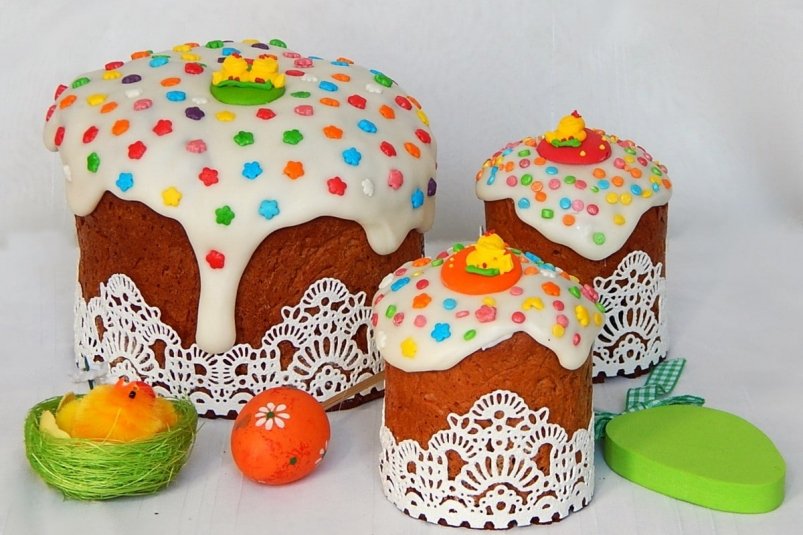 4. Теперь возьмите готовые куличи, которые уже успели остыть, и покройте их глазурью. Можно добавить любые украшения по своему вкусу — делайте это, пока глазурь еще мягкая. Уберите куличи холодильник на 4-5 часов. За это время глазурь схватится и застынет.