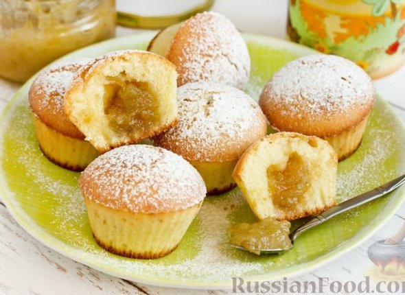 В каждую формочку кладут ложку теста, затем — чайную ложку джема, и снова тесто. Выпекают при 180 °C около 25 минут. Готовые маффины остужают и по желанию посыпают пудрой.