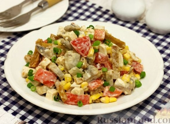 Сочный и сытный салат из курицы, жареных шампиньонов, кукурузы, свежих помидоров и сухариков не требует длительной подготовки. В качестве заправки используется майонез. Такой салат можно с лёгкостью отнести и к повседневным, и к праздничным. Рецепт публикует ИА AngarskMedia.