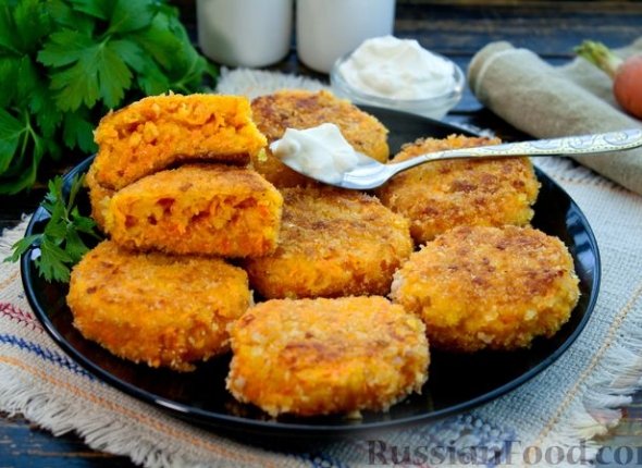 Морковные котлеты с сыром готовы. Перекладываем котлеты на тарелку и подаём, при желании дополнив сметаной.