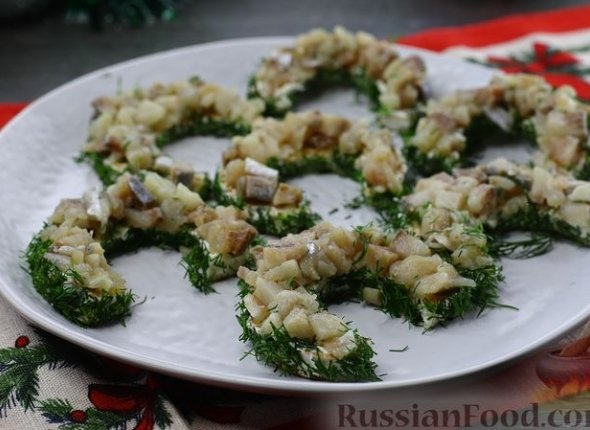 Укроп промойте, обсушите и мелко нарежьте. Филе сельди нарежьте небольшими кубиками. Творожным сыром смажьте поверхность каждой подковы сверху, по бокам и внутри. Обсыпьте боковые и внутренние стороны подков укропом. Таким образом декорируйте все заготовки. Сверху на сыр равномерно выложите нарезанную сельдь.