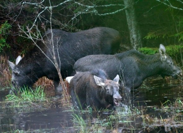 AngarskMedia, 5 декабря. В Ленобласти теплая осень и мягкое начало декабря позволило лосям Нижне-Свирского заповедника продолжать активный поиск пищи на водоемах. Особенно интересен был наблюдаемый семейный выводок — лосиха с почти взрослыми телятами лакомилась сочными подводными растениями.