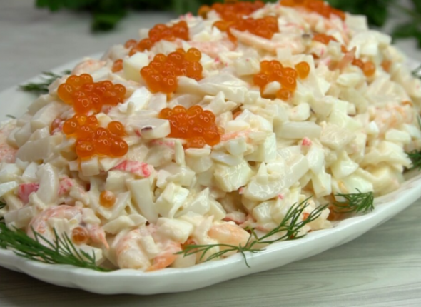 Этот салат готовится без сложных техник, выглядит нарядно и необычно, а вкус получается нежным, свежим и очень сбалансированным. Часто даже те, кто равнодушен к морепродуктам, просят добавку. Отличный выбор для новогоднего и любого праздничного стола.