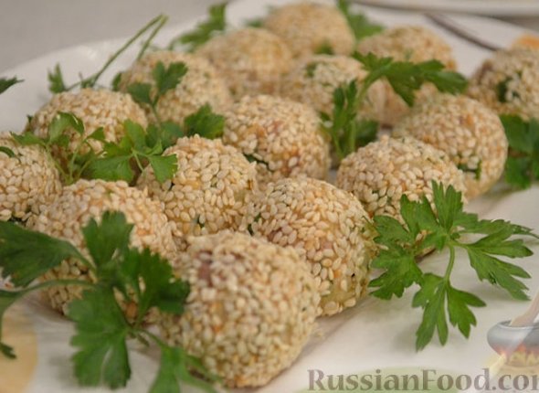 Обвалять шарики в кунжуте. Выложить на блюдо, украсить зеленью.