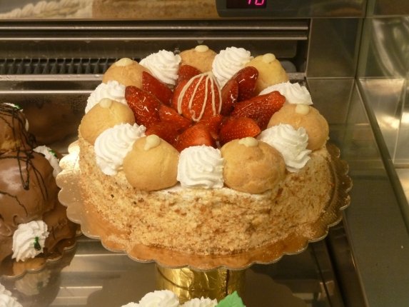 На плоское блюдо положите первый корж и щедро смажьте его заварным кремом. Повторите с остальными коржами. Верхний корж также смажьте кремом. Выпеченные обрезки теста измельчите в крошку и посыпьте ею торт со всех сторон.