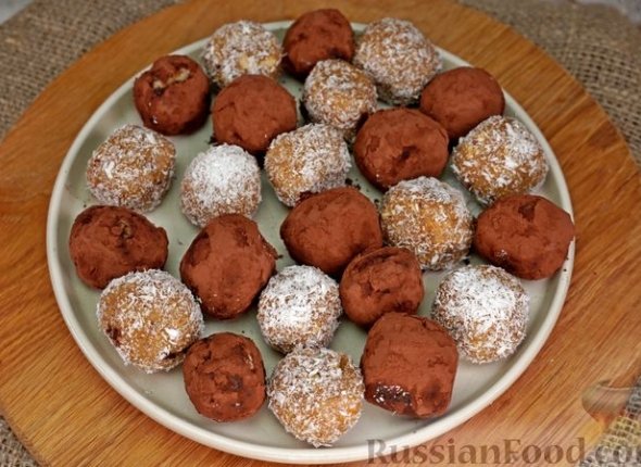 Обваливаем половину конфет в кокосовой стружке. Оставшиеся конфеты обваливаем в какао-порошке.