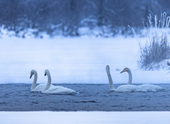 AngarskMedia, 7 января. В центре Приозерска стая диких лебедей-кликунов выбрала для зимовки местные полыньи. Несмотря на понижение температуры и активное промерзание водоемов, мощное течение реки Вуоксы создает естественные "окна" в ледяном панцире.