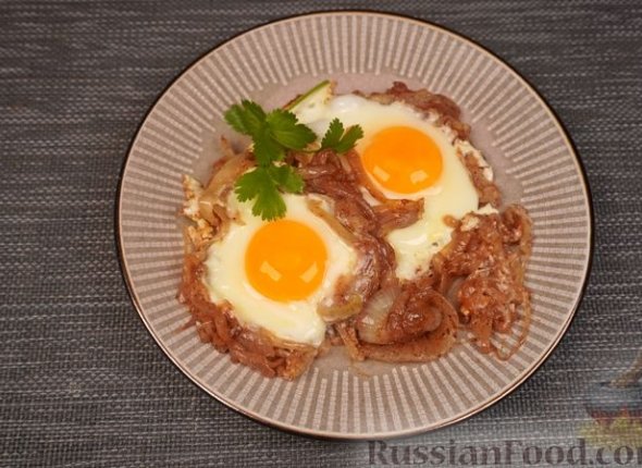 Посыпаем чёрным перцем и солью. Перемешиваем. Делаем 4 углубления. В них отправляем яйца (чтобы пожарились все яйца одновременно, лучше сначала разбить их в миску). Яичный белок схватился — яичница в луковом соусе готова.