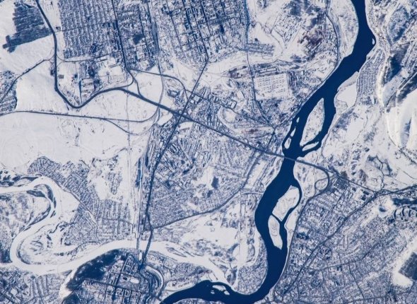 По словам космонавта, с высоты космоса город выглядит особенно выразительно: темная линия Ангары словно рассекает белоснежное полотно, кварталы выстраиваются в чёткую геометрию, а вокруг простираются огромные пространства, в которых ощущаются масштаб, тишина и внутренняя сила сибирской земли.