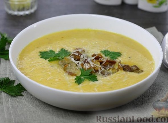 Разлейте суп по порционным тарелкам. Добавьте жареный бекон, натёртый сыр и зелень петрушки.