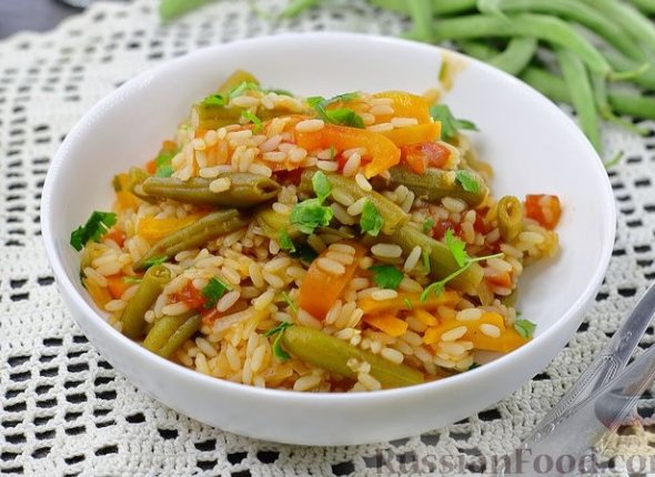 Рис с овощами и стручковой фасолью, приготовленный на сковороде, готов.