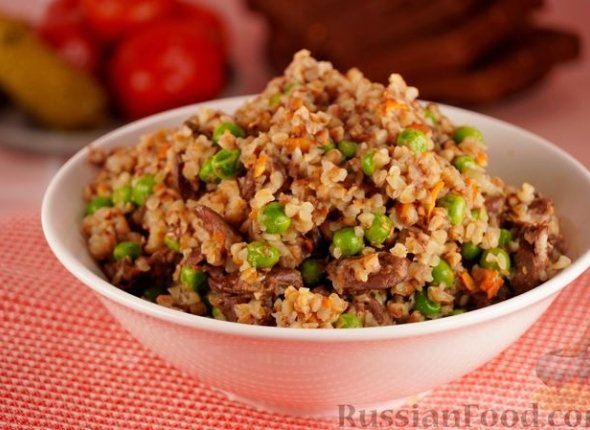 Подаём гречку с куриными сердечками и горошком сразу же.