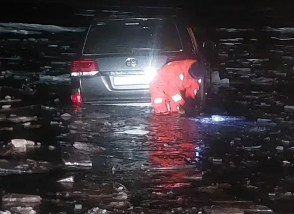 В пятницу, 20 февраля, около 22.00 спасатели Байкальского поисково-спасательного отряда МЧС России совместно с полицейскими возвращались с поисковых работ от мыса Хобой, где днём провалилась под лёд "буханка" с группой туристов. В Куркутском заливе в 5 км от берега служащие заметили в "ледяной ванне" иномарку Toyota Land Cruiser.