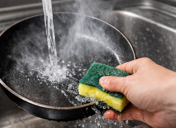 После жарки температура масла в сковороде может достигать 200-250°C. Металл при нагревании расширяется, а при охлаждении быстро сжимается . Если резко полить раскалённую посуду холодной водой, наружный слой остынет быстрее внутреннего — это приводит к появлению трещин и деформации: дно становится неровным, в последствии чего сковорода будет неравномерно прилегать к плите.