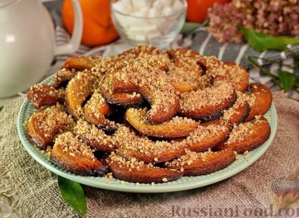 Раскатываем тесто в пласт толщиной 5 мм. Вырезаем формой полумесяцы. Выкладываем на противень, застеленный пергаментом. Ставим в разогретую до 180 °C духовку на 25-30 минут.
