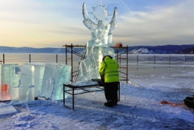 Мастера работают прямо на берегу, вырезая из прозрачного байкальского льда будущие композиции